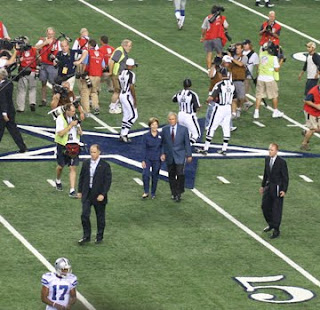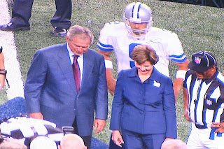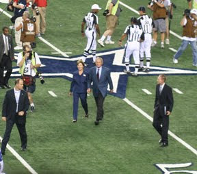 President George W. Bush and wife Laura were ushered onto the field from the western end zone for the ever-common coin toss which assigns the ball’s first carrier in every football game. At his introduction, the crowd began to cheer and applaud. One person yelled out “We love you George” and the phrase was picked up by others who repeated it. Bush tossed the coin and the small group gathered on the blue star immediately looked down to see it’s outcome. The Cowboys won.