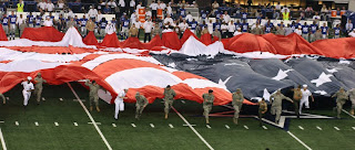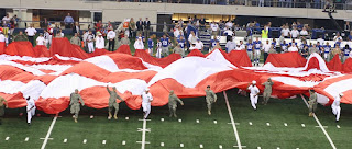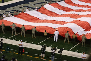 A flag was carried out by military individuals of all branches of the service who seemed proud and excited to be selected to help display Old Glory, which by the time everyone was in place, stretched the entire width of the field.